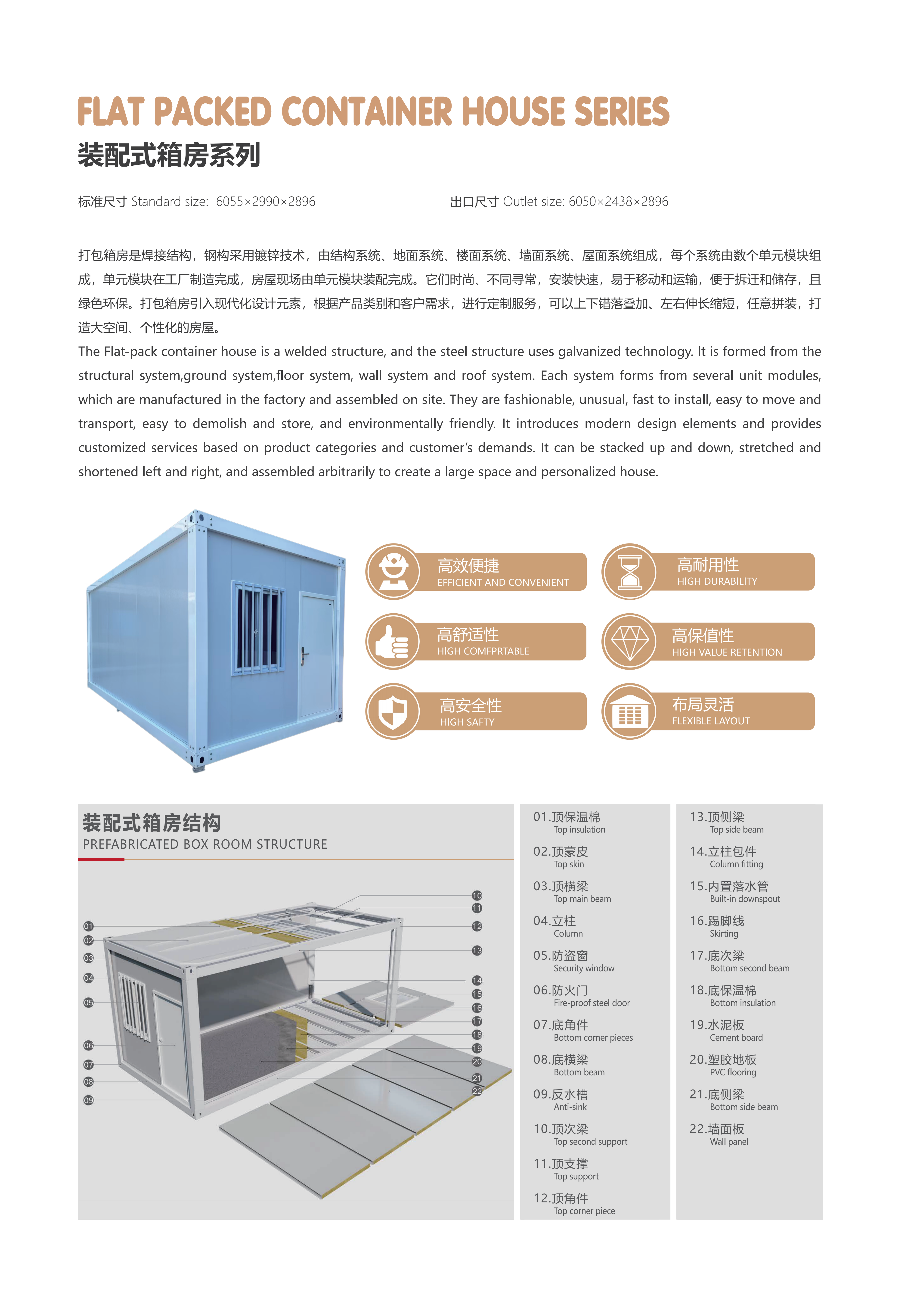 The Flat-pack container house is a welded structure, and the steel structure uses galvanized technology. It is formed from the structural system,ground system,floor system, wall system and roof system. Each system forms from several unit modules, which are manufactured in the factory and assembled on site. They are fashionable, unusual, fast to install, easy to move and transport, easy to demolish and store, and environmentally friendly. It introduces modern design elements and provides customized services based on product categories and customer’s demands. It can be stacked up and down, stretched and shortened left and right, and assembled arbitrarily to create a large space and personalized house.
